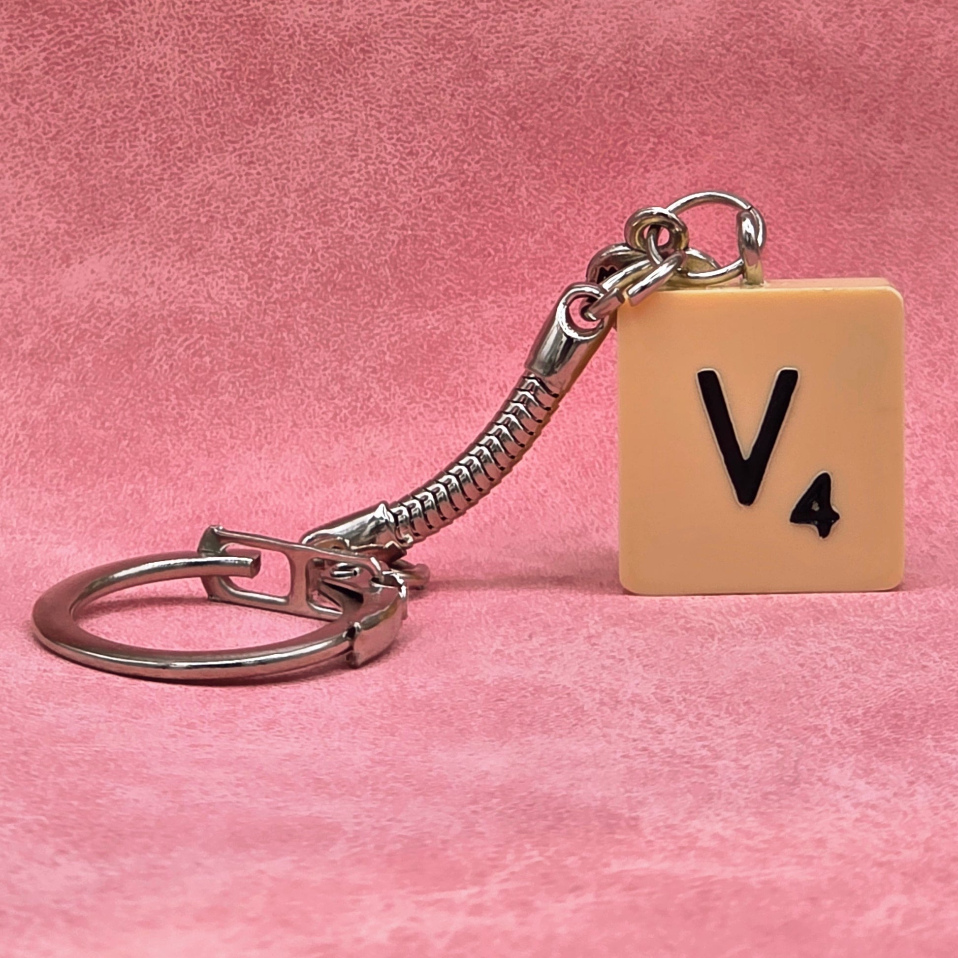 Letter 'T & V' handmade keyring, made with a 1955 vintage Scrabble® game tile. Part of my re-imagined collection, this keyring represents my love of reusing and reimagining things instead of throwing them away.